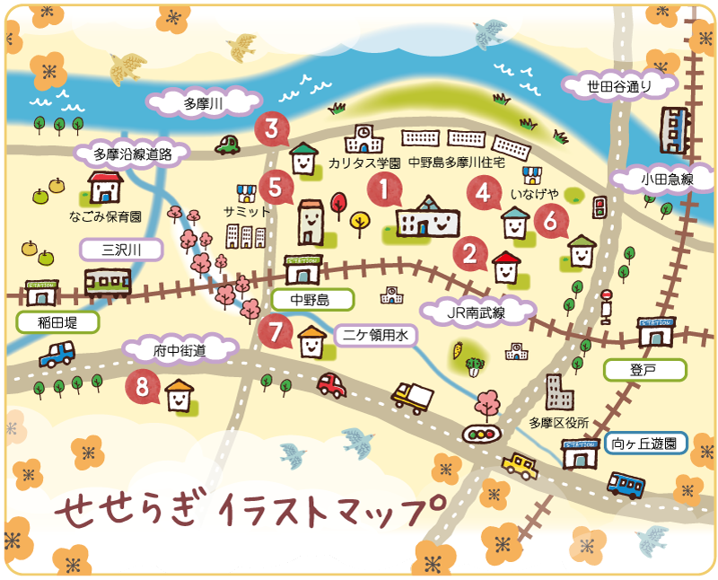 古くから多摩川がこの地を潤してきたように、自然豊かな多摩区に私たちも根を生やし、生きる力をはぐくみ、たくさんの笑顔を作って地域の方々とともにこの地を、人の心を潤します。